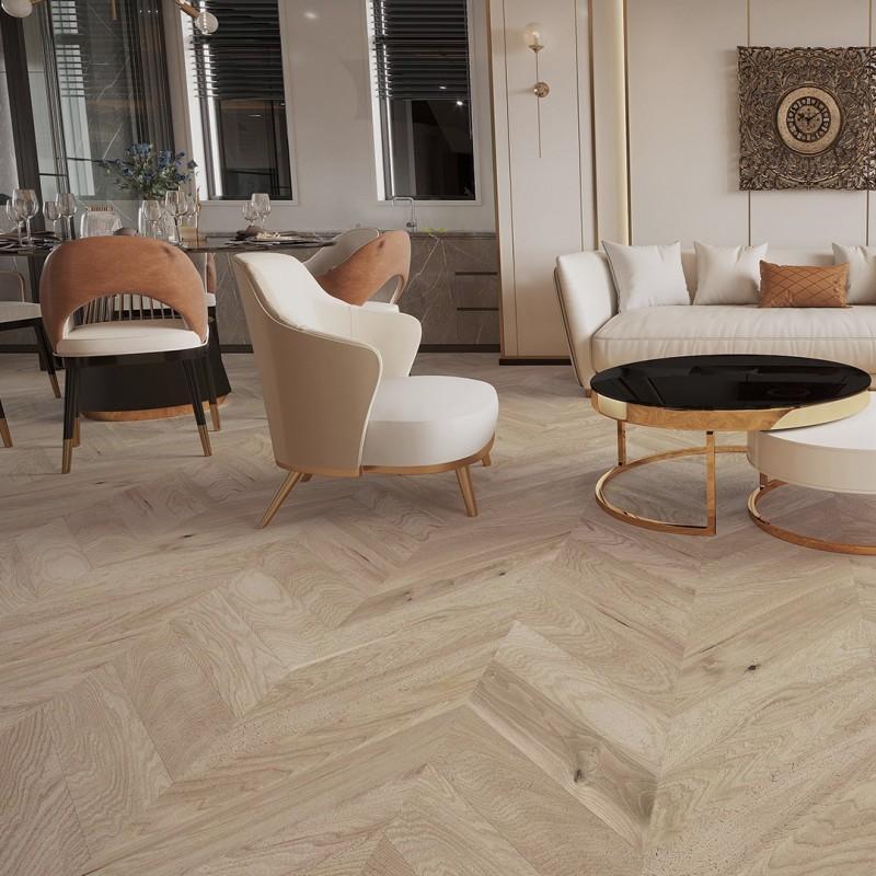 Паркетная доска Bianco Piccolo Chevron относится к категории «французская елка». Это означает, что все ее плашки имеют одинаковую длину и подрезаны под углом 45 градусов. Благодаря этой особенности пол визуально «вытягивает» помещение, а рисунок завораживает.