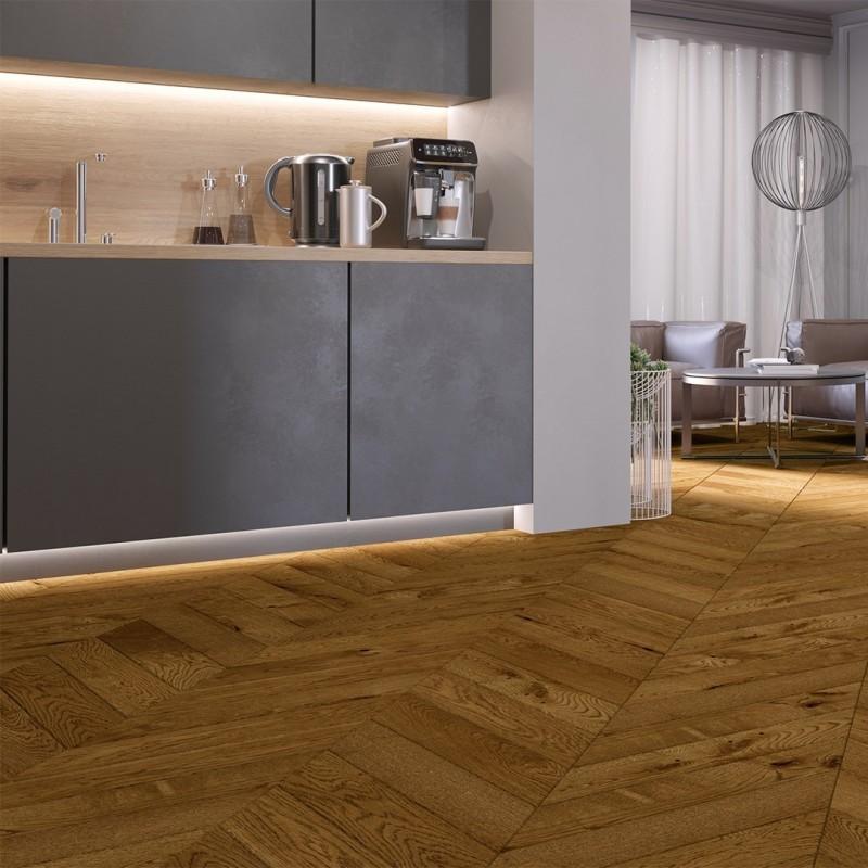 Паркетная доска французская елка Honey Piccolo Chevron от ТМ Barlinek создана в медовом цвете с коньячным оттенком. Ее природная структура настоящего дерева метко подчеркивает покрытие матовым лаком с брашированием. Наличие же 4-сторонней фаски демонстрирует легкость покрытия и создает красивую игру света на полу.