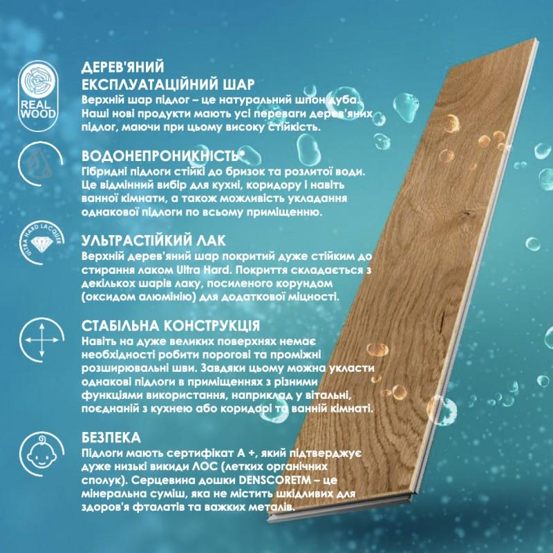Верхний слой гибридных полов – это натуральный шпон настоящего дерева дуба толщиной 1 мм, имеющий глубокую структурированную текстуру. Эти полы обладают всеми преимуществами деревянных полов, но в дополнение получили от производителя дополнительную стойкость.