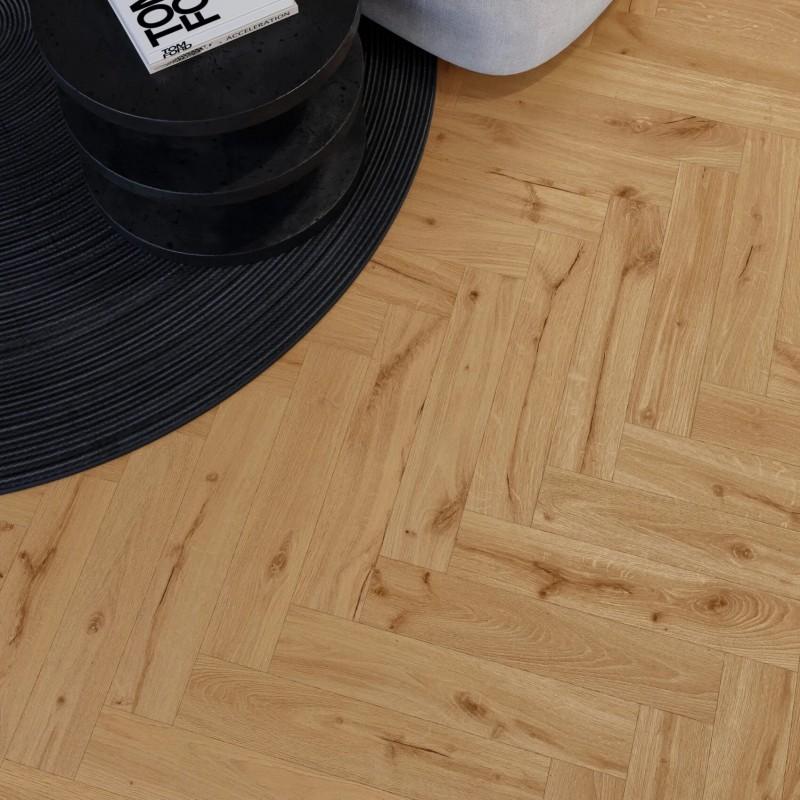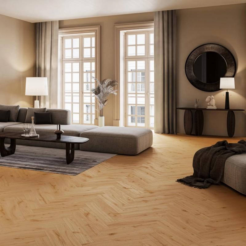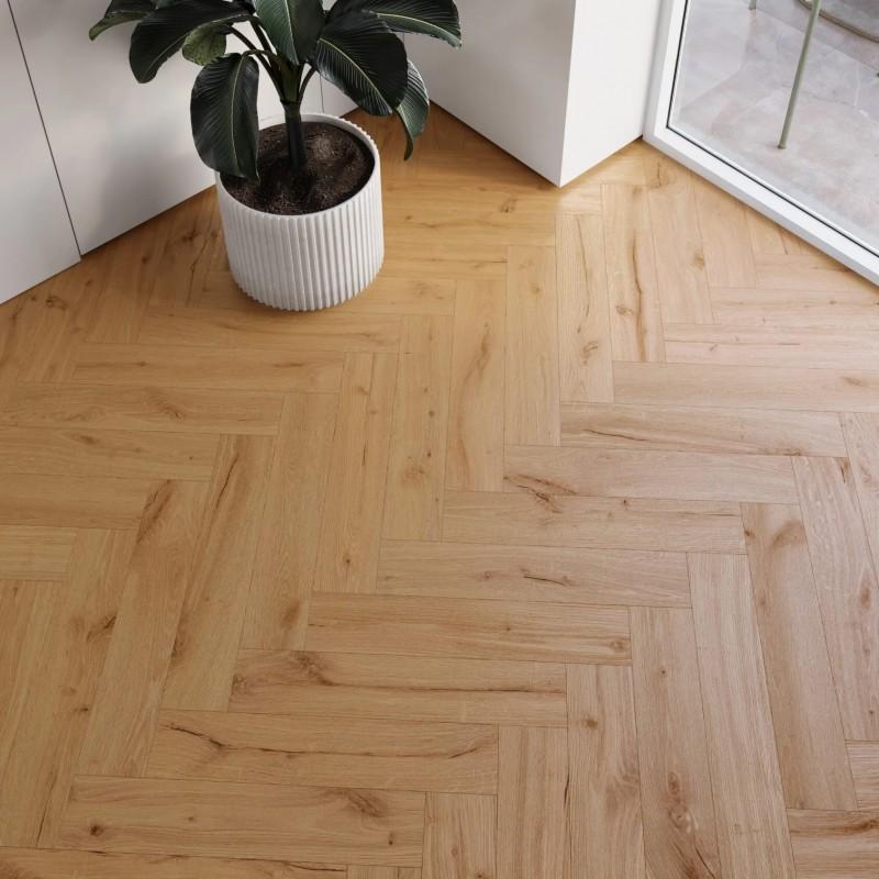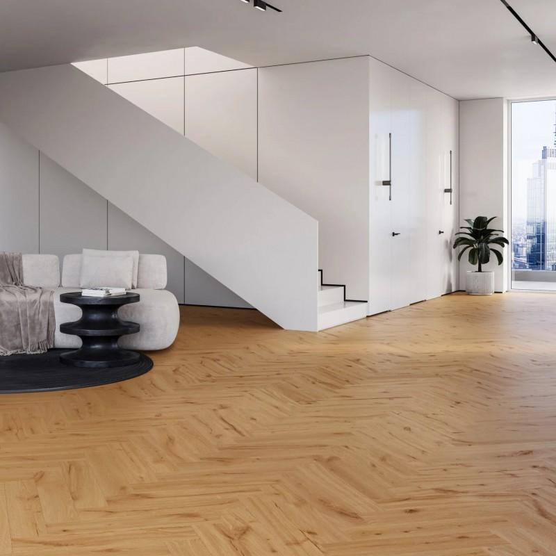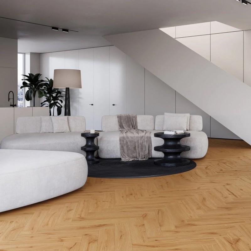 Виниловый пол Дуб Ginger Классическая Елка наполнит ваш дом неповторимой свежестью и живой гармонией. Его насыщенные медовые оттенки, уложенные узором "елка", создают атмосферу природного уюта и безмятежности. Это идеальное решение для создания динамичного и изысканного пространства, где царит спокойствие и тепло.