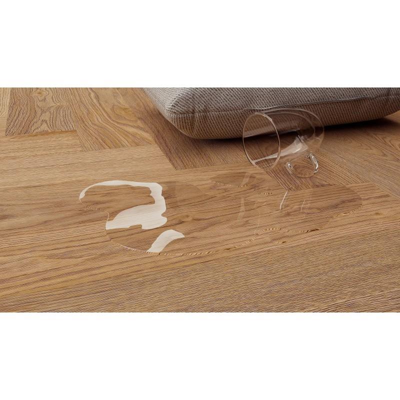 Водостійкість. Покриття не боїться вологи, не розбухає та не деформується навіть при тривалому контакті з водою. Ідеально підходить для кухні, коридору та інших приміщень із підвищеною вологістю.
