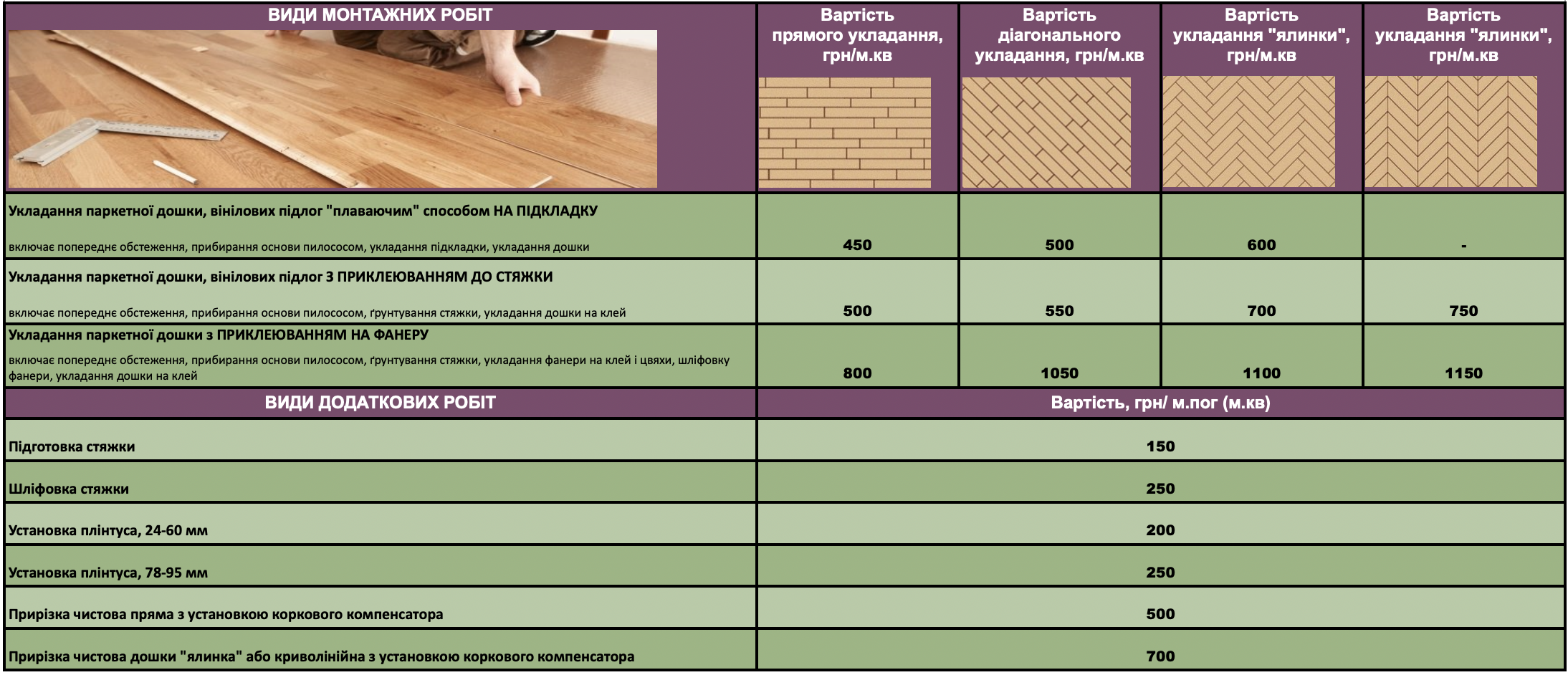 Вартість робіт з вкладання паркетної дошки та установки плінтусу сертифікованими паркетниками